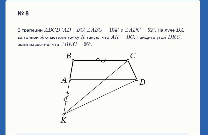 СРОЧНО. 20 БАЛЛОВ. В трапеции ABCD (AD∥BC) ∠ABC=104∘ и ∠ADC=52∘. На луче BA за точкой A отметили точку K такую, что AK=BC. Найдите угол DKC, если известно, что ∠BKC=26∘.