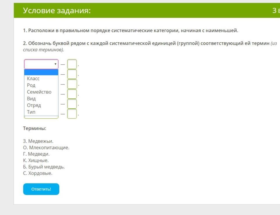 1. Расположи в правильном порядке систематические категории, начиная с наименьшей.