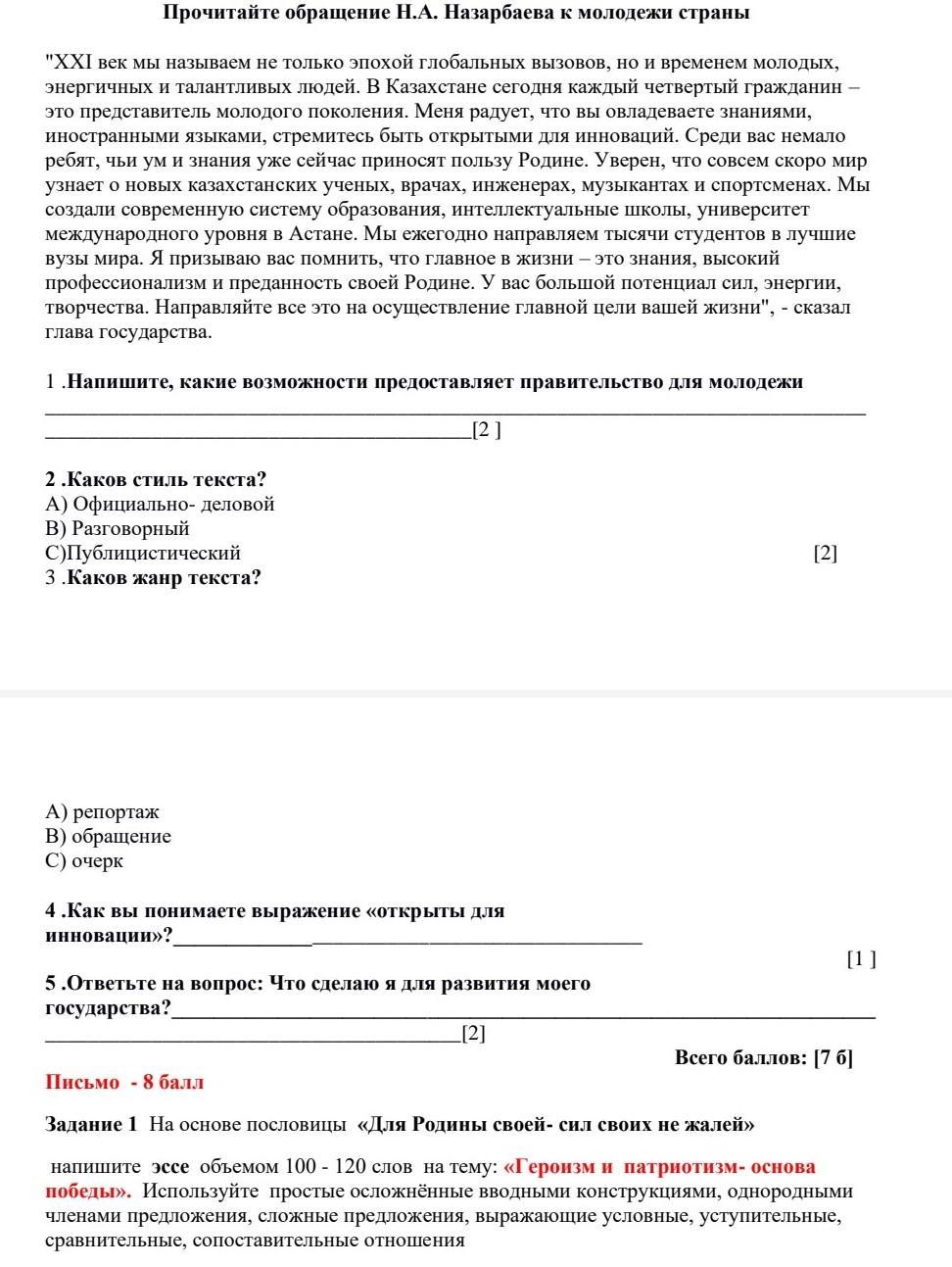 Прочитайте обращение Н.А. Назарбаева к молодежи страны