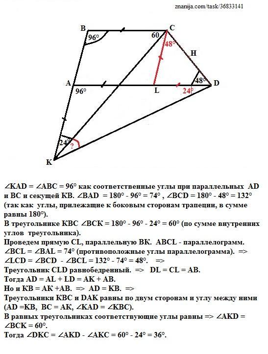 В трапеции ABCD (AD∥BC) ∠ABC=96∘ и ∠ADC=48∘ На луче BA за точкой A отметили точку K такую, что AK=BC . Найдите угол DKC, если известно, что ∠BKC=24∘.