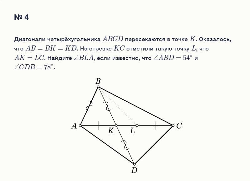СРОЧНО ДАЮ 20 БАЛЛОВ Диагонали четырёхугольника ABCD пересекаются в точке K. Оказалось, что AB=BK=KD. На отрезке KC отметили такую точку L, что AK=LC. Найдите ∠BLA, если известно, что ∠ABD=54∘ и ∠CDB=78∘.