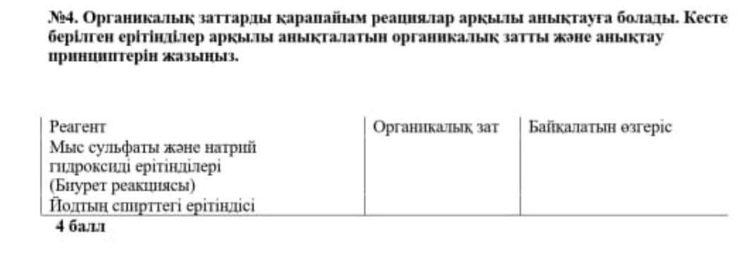 органикалық заттарды қарапайым реакциялар арқылы анықтауға болады.кесте берілген ерітінділерж арқылы анықталатын органикалық затты және анықтау принциптерін жазыңыз