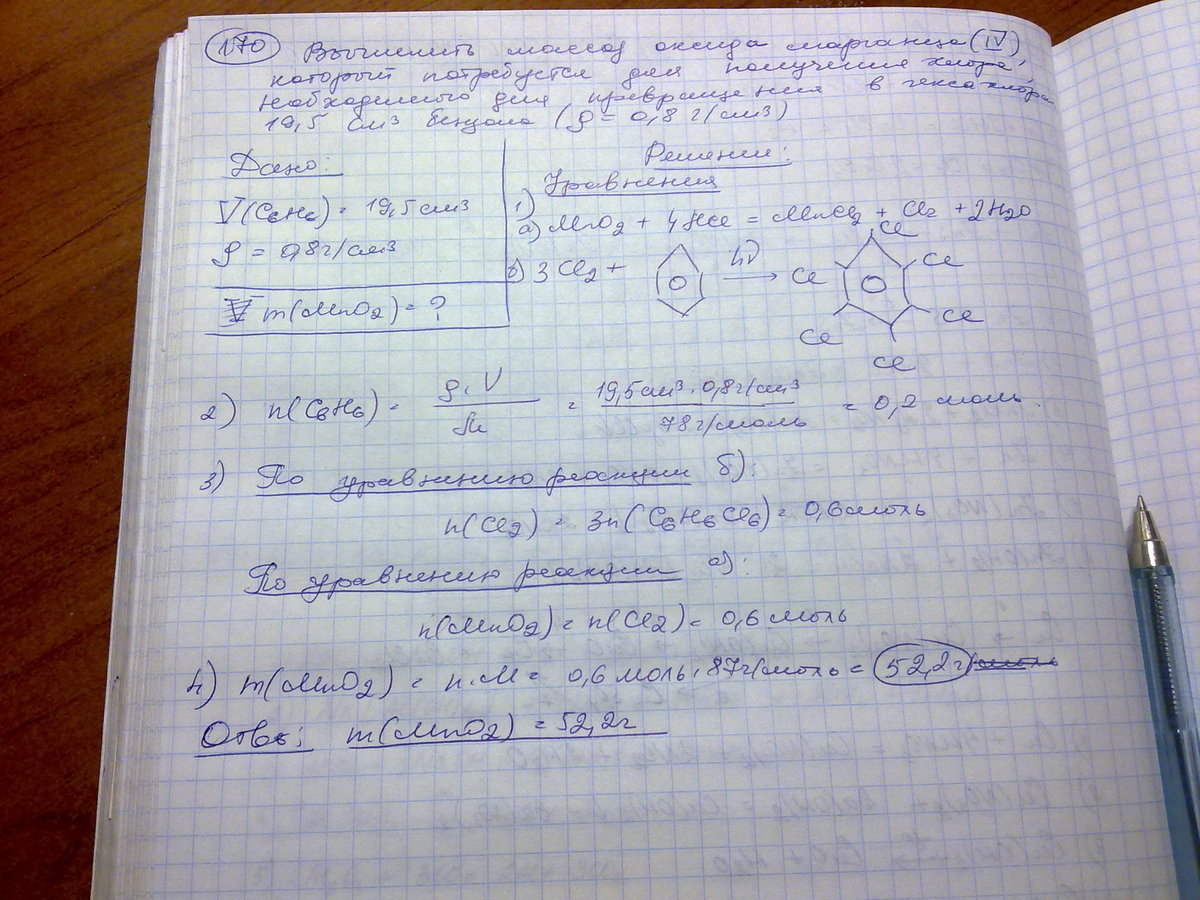 Вычислите массу оксида марганца (IV), который потребуется для получения хлора, необходимого для превращения в гексахлоран 19,5 см3 бензола (ρ = 0,8 г/см3).