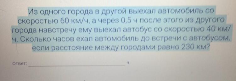 Из одного города в другой выехал автомобиль со скоростью 60 км/ч, а через 0,5 ч после этого из другого города навстречу ему выехал автобус со скоростью 40 км/ч. Сколько часов ехал автомобиль до встречи с автобусом, если расстояние между городами равно 230 км?