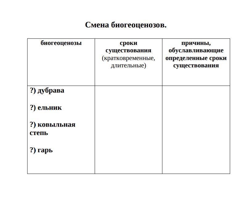 Гарь - ну гарь она не населена почти ничем, по этому это кратковременный биогеоценоз. Гарь обычно очень быстро заполоняется растениями, сначала мхами, травой, затем кустарниками, потом и деревьями.