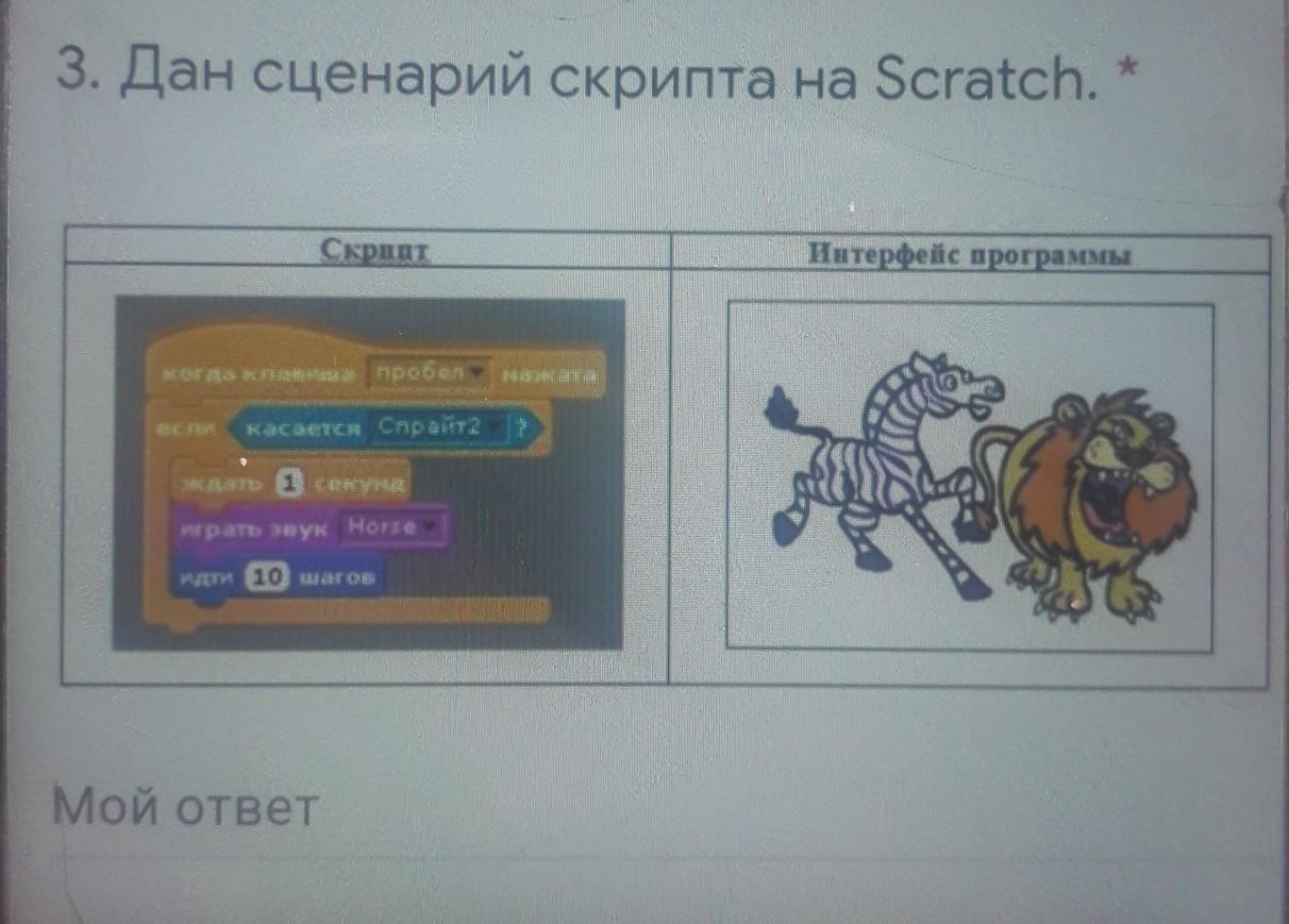 Объяснение:При котором программа считывает , касается ли спрайт 1 спрайт 2, если так то спрайт 1 ждёт одну сеекунду воспроизводится звук Horse и спрайт один делает 10 шагов