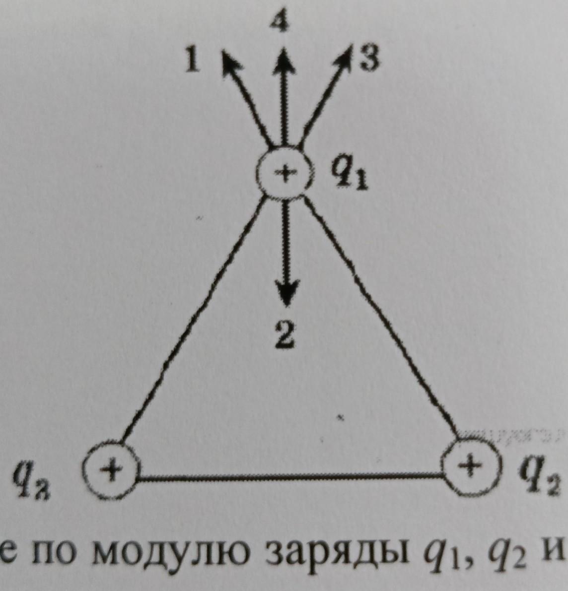 В вершинах равностороннего треугольника расположены равные по модулю заряды q1, q2 и q3 (см.рисунок). Какому вектору сонаправлена суммарная сила, действующая на заряд q1 со стороны зарядов q2 и q3.