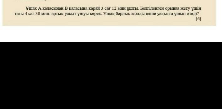 Белгіленген орынға жету үшін тағы 4сағ 38мин артық уақыт ұшуы керек.Ұшақ барлық жолды неше уақытта ұшып өтеді?
