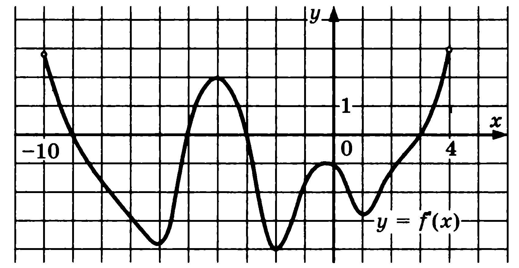 На рисунке изображен график производной функции у = f(x), определённой на (-10; 4). Найдите промежутки убывания функции f(x). В ответе укажите длину наибольшего из них.