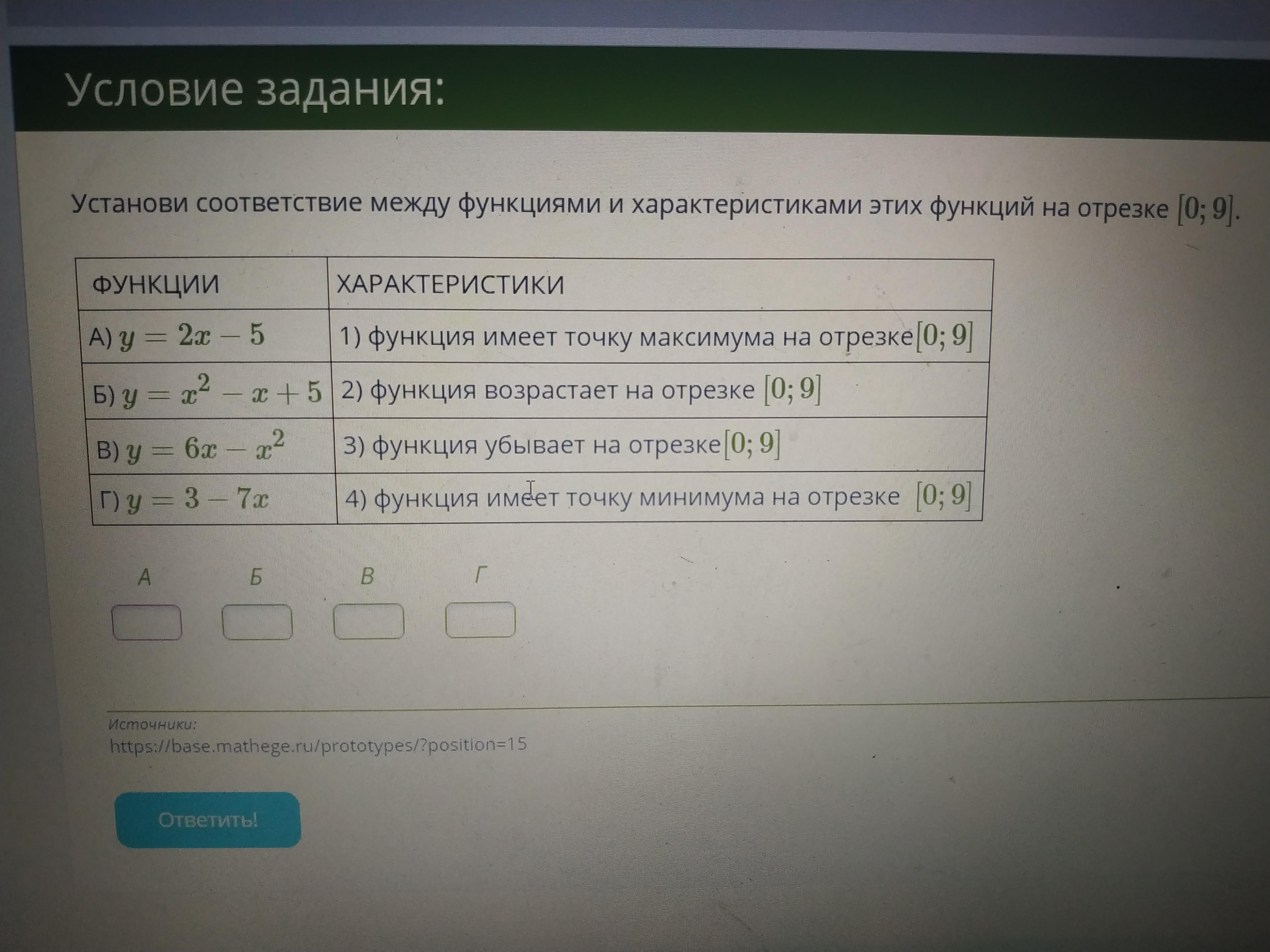 Установи соответствие между функциями и характеристиками этих функций на отрезке [0,9]