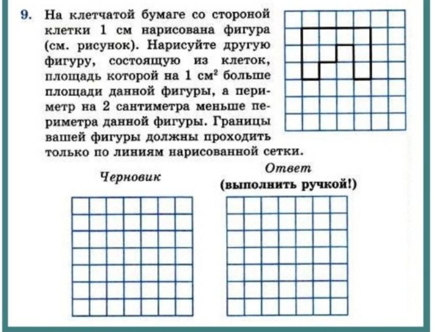 На клетчатой бумаге со стороной клетки 1см нарисована фигура (см. Рисунок) нарисуйте другую фигуру, состоящую из клеток, площадь которой на 1см на квадратный сантиметр больше площади данной фигуры, а периметр на 2 см меньше периметра фигуры.Границы вашей фигуры должны проходить только по линиям нарисованной сетки
