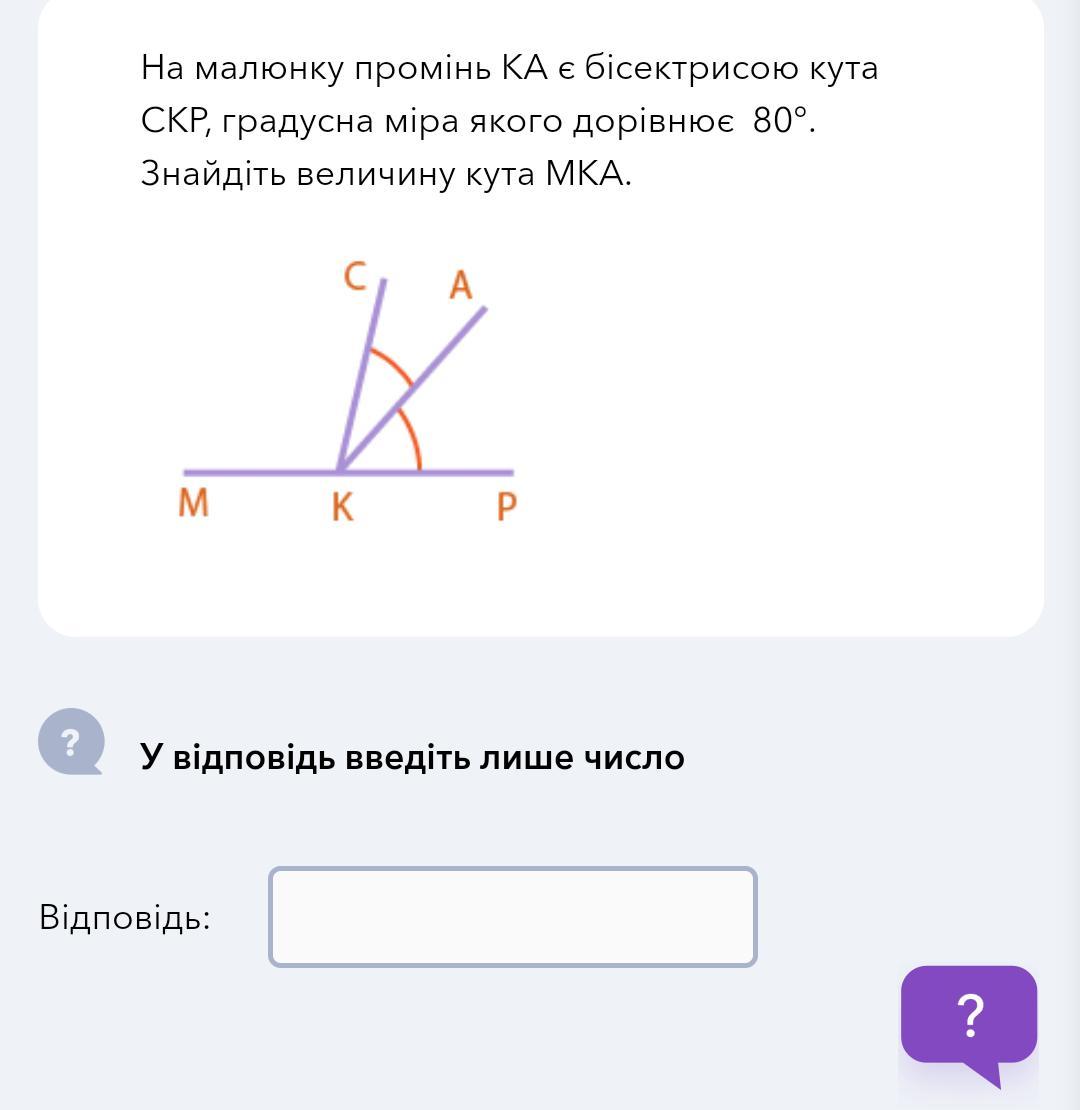 Значит, СКР:2=80:2=40 градусов равен угол СКА