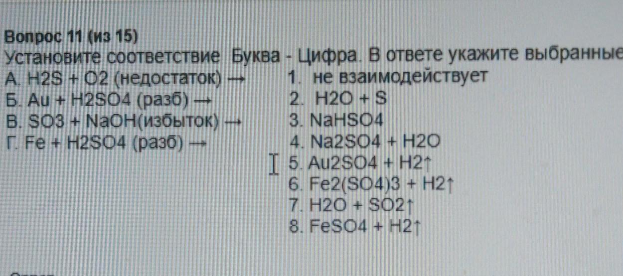 A. H2S + O2 (недостаток) — 1. не взаимодействует