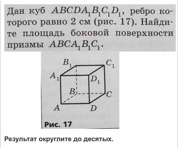 дан куб АВСДА1В1С1Д1 ребро которого равно 2 см (рисунок 17) найдите площадь боковой поверхности призмы авса1в1с1. Результат округлите до десятых