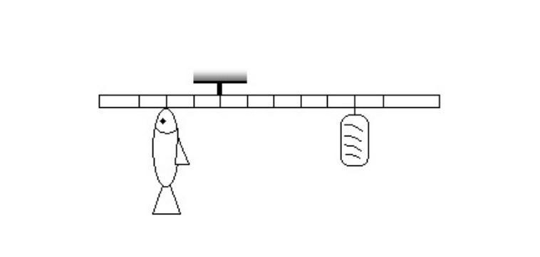 К невесомому рычагу подвесили два груза. Чему равен вес рыбы, если масса хлеба равна 2 кг? Ответ выразите в единицах СИ. Сами единицы указывать не нужно