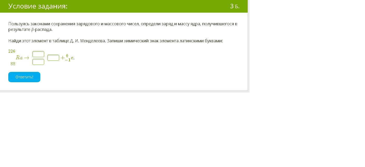 Пользуясь законами сохранения зарядового и массового чисел, определи заряд и массу ядра, получившегося в результате β-распада.