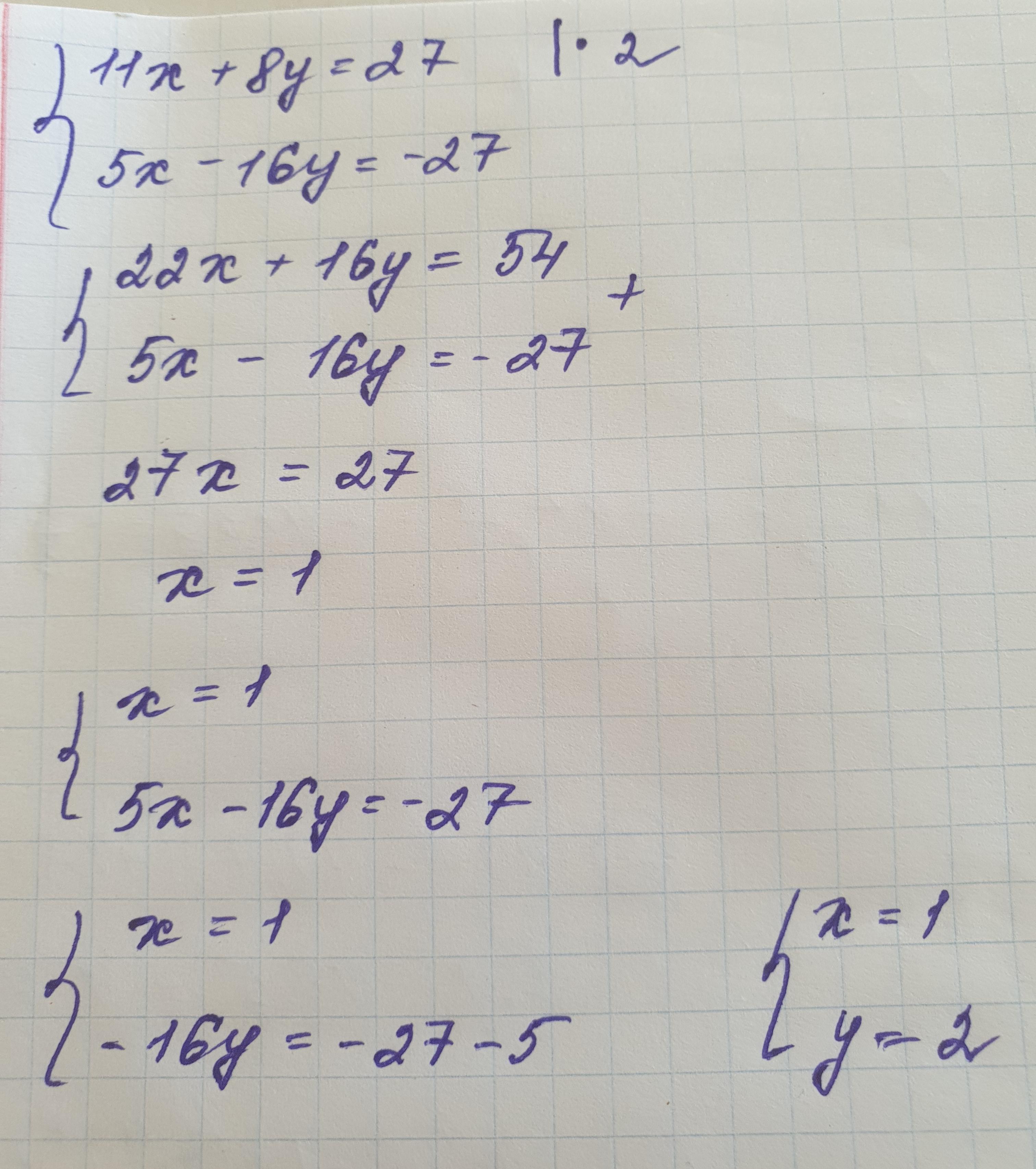 {11x+8y=27 |*2 / {22x+16y=54 /{27x=27 /{x=1 /{x=1 / x=1