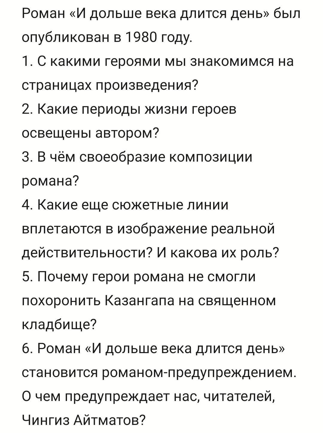 Ответ:Все события романа происходят в 1 день. У Едигея умер его близкий друг Казангап и он везет его на дальнее кладбище. И во время долгого и трудного пути вспоминает всю свою долгую, богатую событиями жизнь