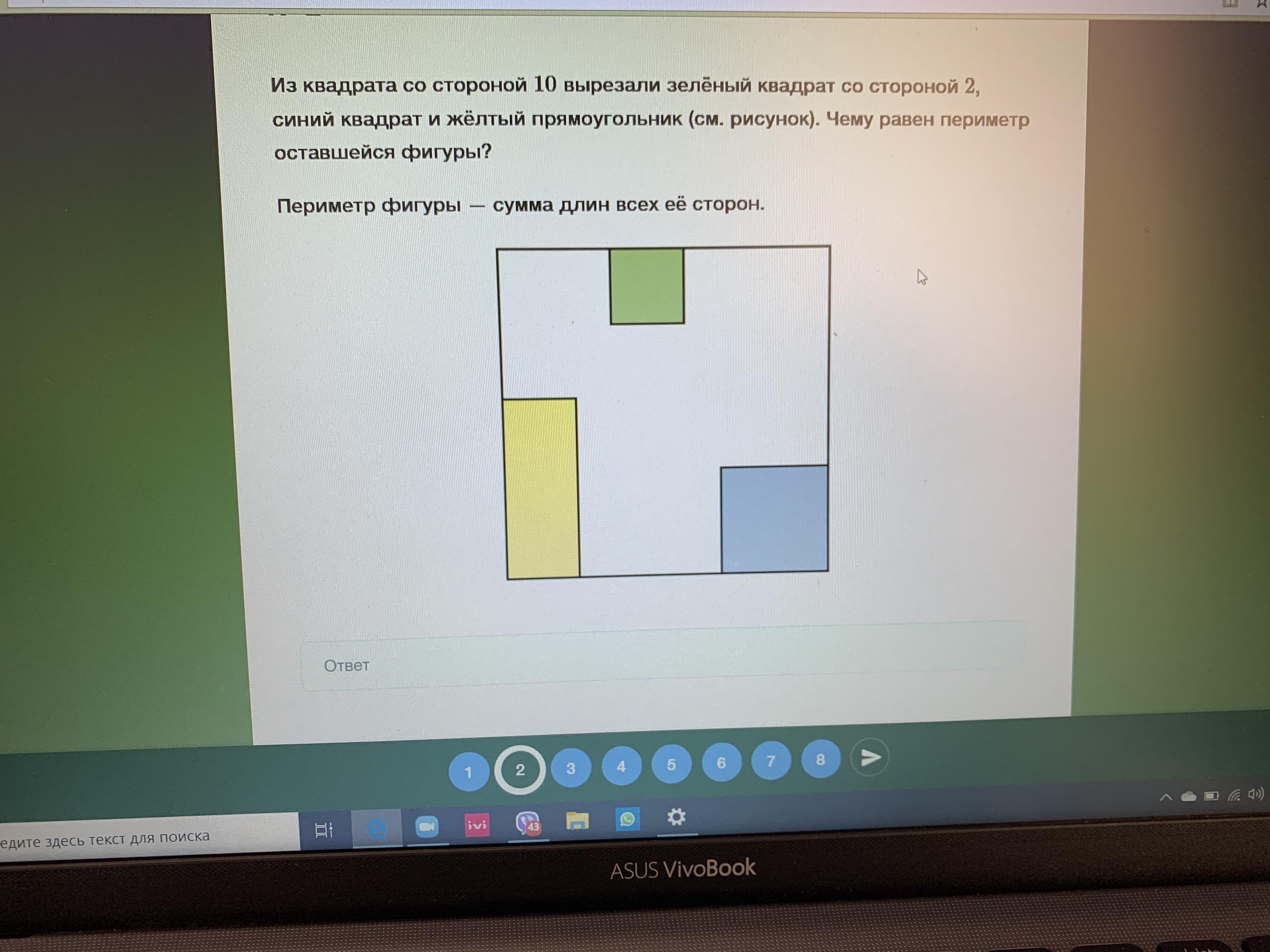 Из квадрата со стороной 10 вырезали зелёный квадрат со стороной 2, синий квадрат и желтый прямоугольник (см.рисунок). Чему равен периметр оставшейся фигуры?ПРОШУ СРОЧНО
