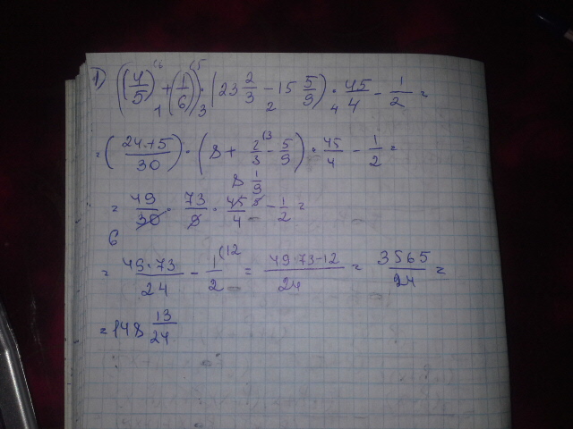 1) (4/5+1/6)*(23 2/3- 15 5/9)*45/4-1/2=