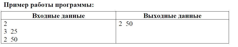 Напишите программу для решения следующей задачи. Участники парусной регаты стартовали одновременно. На финише фиксировалось время прохождения маршрута каждой яхтой (в часах и минутах). Определите время победителя регаты (в часах и минутах). Известно, что соревнования проходили в течение 12 часов. Программа получает на вход количество яхт, принимавших участие в регате N (1 ≤ N ≤ 100), затем для каждой яхты вводится два числа: часы и минуты, затраченные на прохождение маршрута.