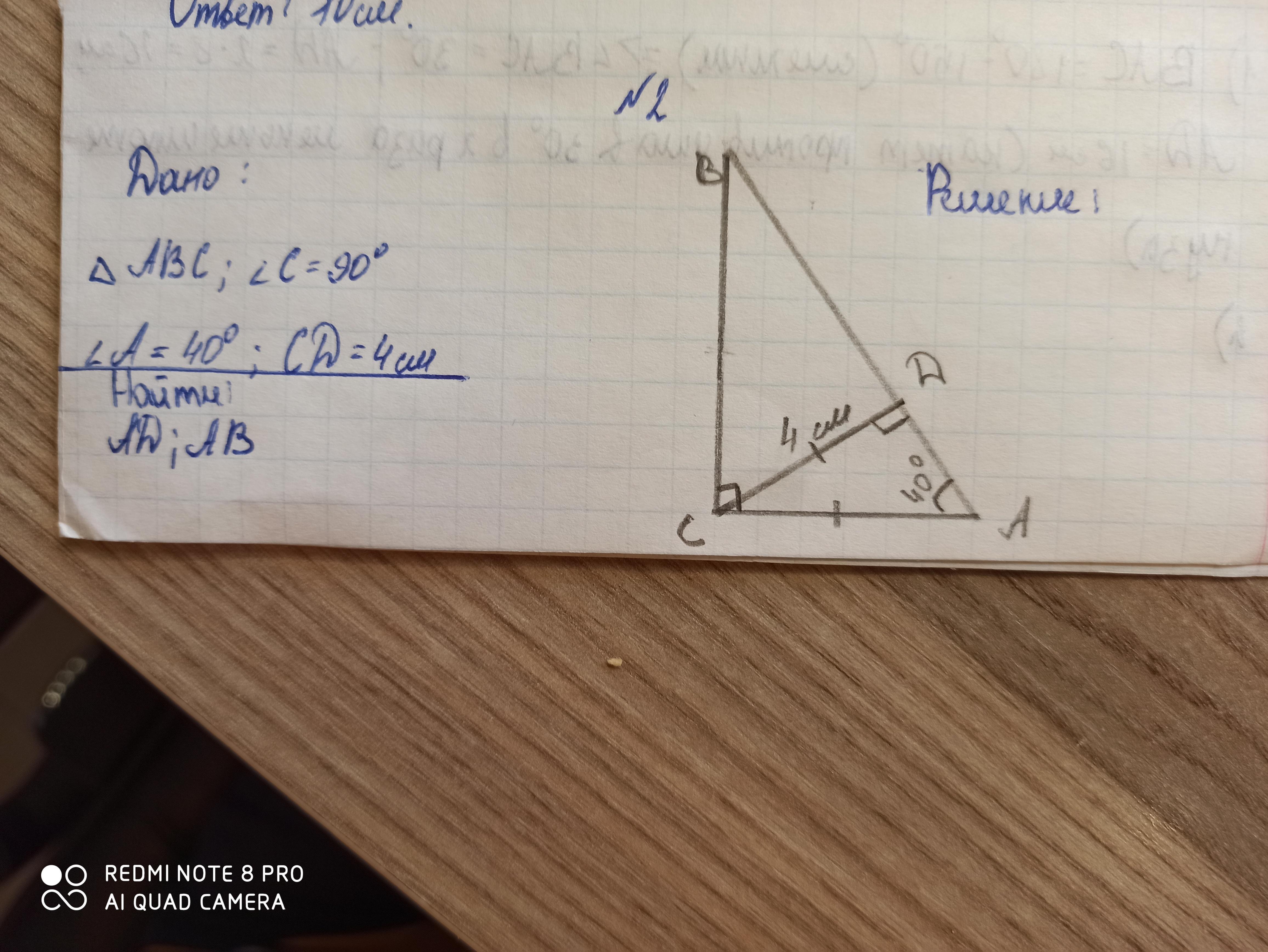 Дано: треугольник ABC,угол А=40градусов, угол С=90 градусов CD=4см. Найти: AD,AB. 7 класс. Срочно пожалуйста