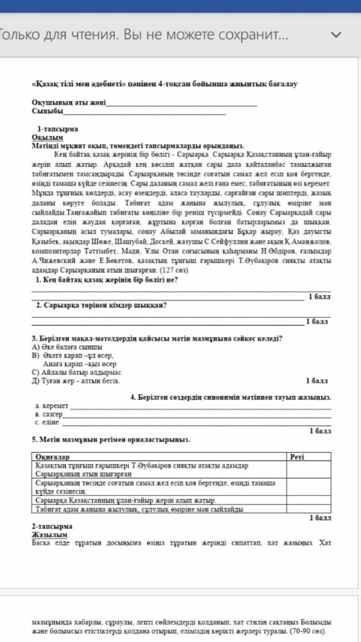 2)Сарыарқа төрінен шыққан атақты адамдарды өзі тізіп шығады, оқушының мәтіннен тыс жазған ақпараты есептеледі (егер Сарыарқадан шығып жатса)