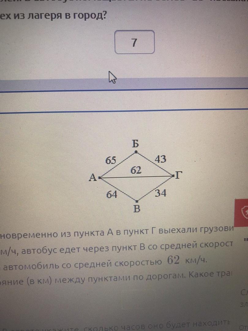 Из пункта А в пункт Г ведут три дороги. Одновременно из пункта А в пункт Г выехали грузовик, автобус и легковой автомобиль. Грузовик едет через пункт Б со средней скоростью 54 км/ч, автобус едет через пункт В со средней скоростью 56 км/ч. По третьей дороге — без промежуточных пунктов — едет легковой автомобиль со средней скоростью 62 км/ч.