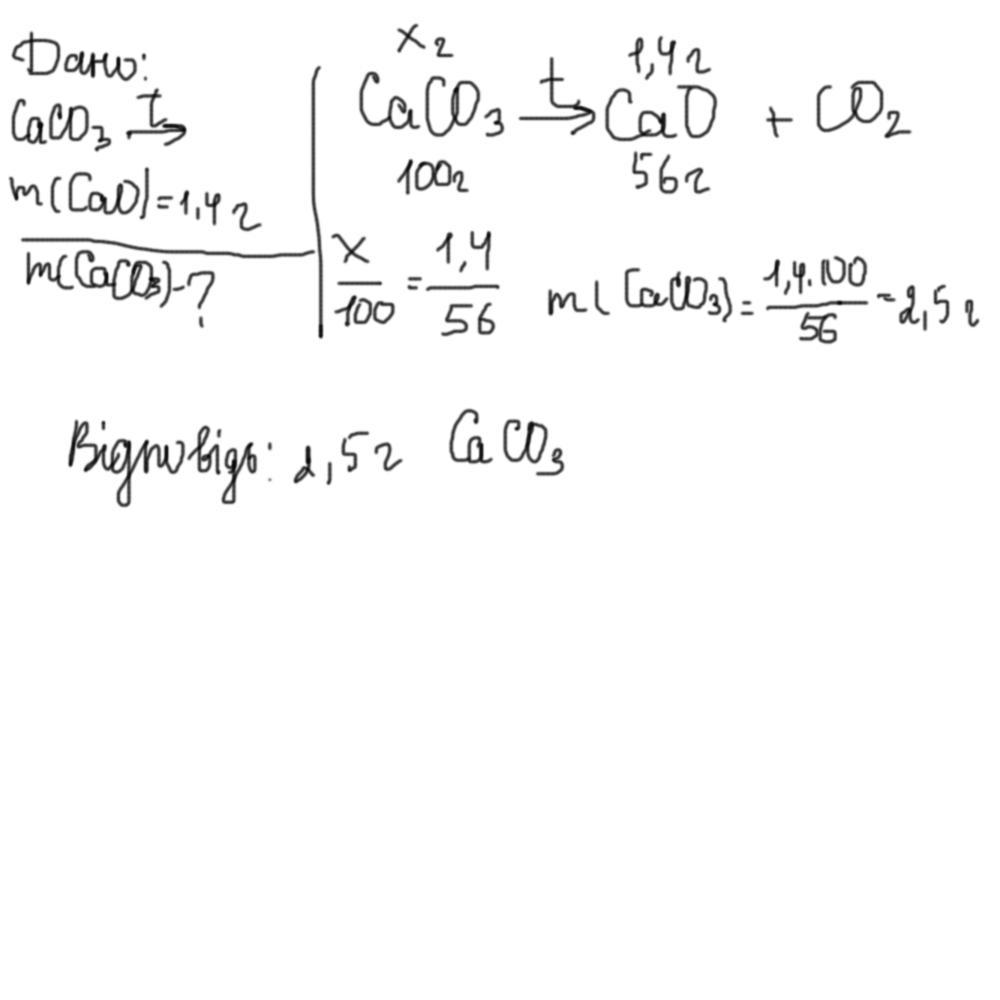 Розв'яжіть задачу Під час термічного розкладу кальцій карбонату утворилося 1,4 г кальцій оксиду. Яка маса кальцій карбонату піддалася розкладу?