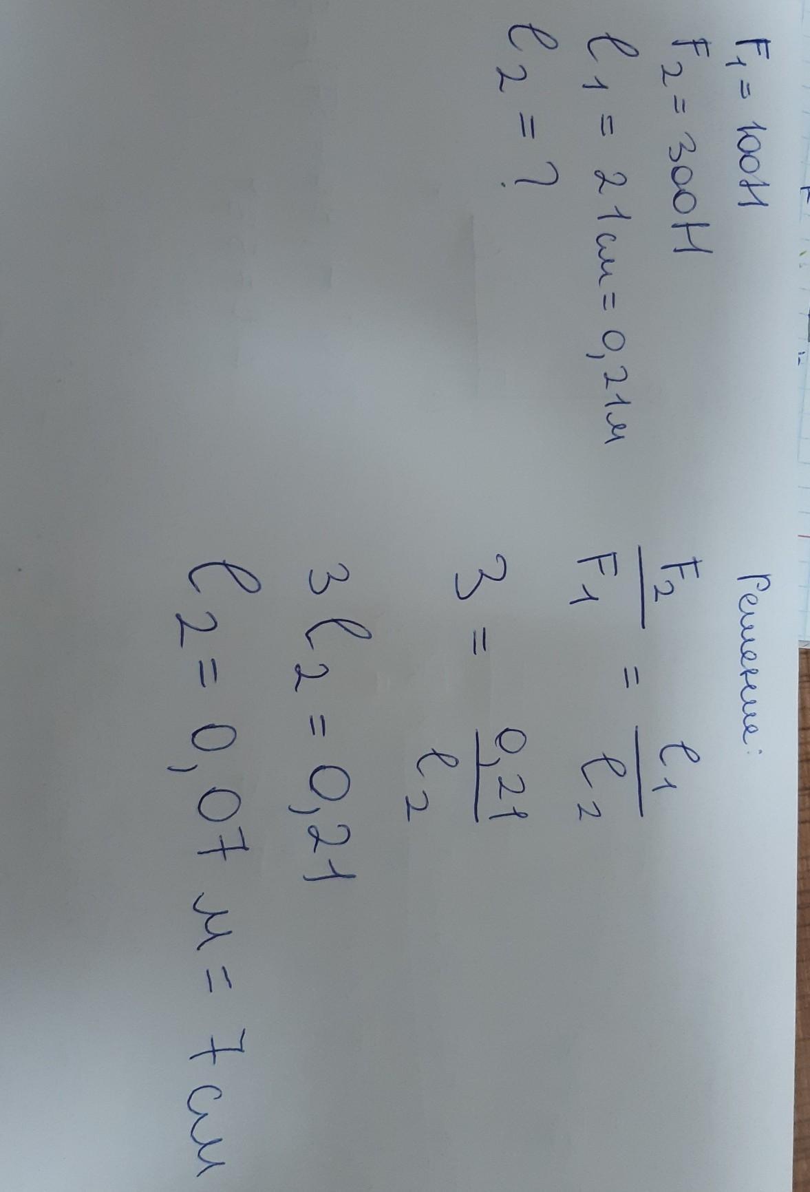 На одно плечо рычага, равное 21 см, действует сила 100 Н, на другое — сила 300 Н. На каком расстоянии от оси рычага нужно приложить вторую силу, чтобы он находился в равновесии? (ответ в метрах)