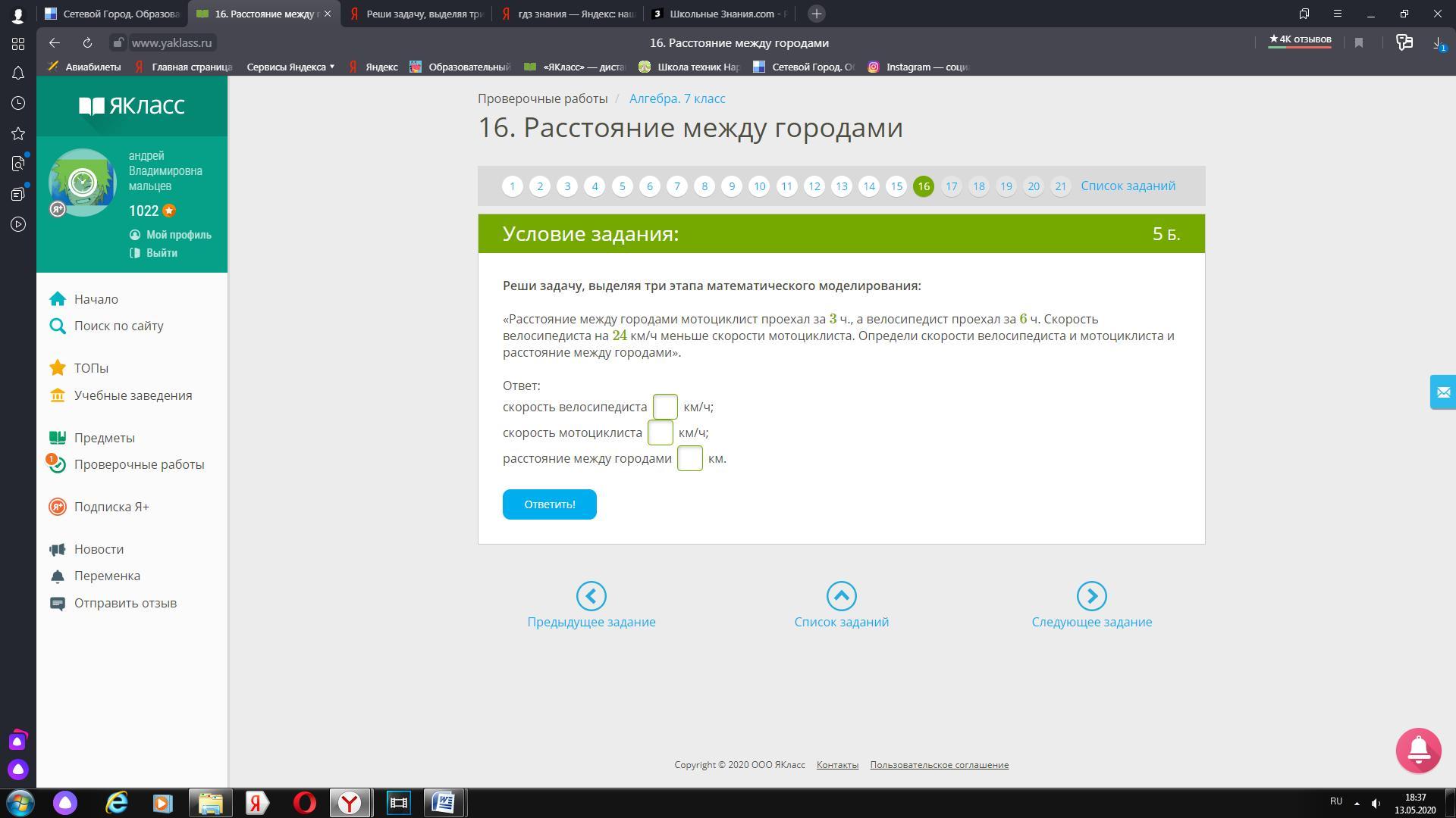 «Расстояние между городами мотоциклист проехал за 3 ч., а велосипедист проехал за 6 ч. Скорость велосипедиста на 24 км/ч меньше скорости мотоциклиста. Определи скорости велосипедиста и мотоциклиста и расстояние между городами».