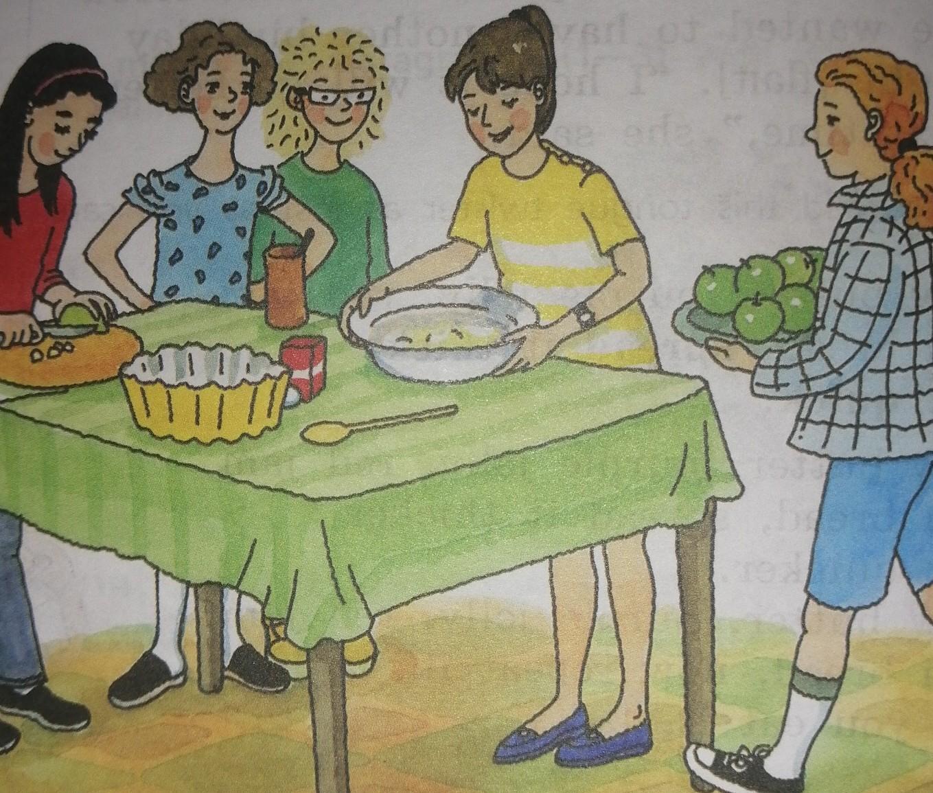 5 teenagers are preparing the table for a lunch. teenagers are bringing different kinds of dishes on that table.