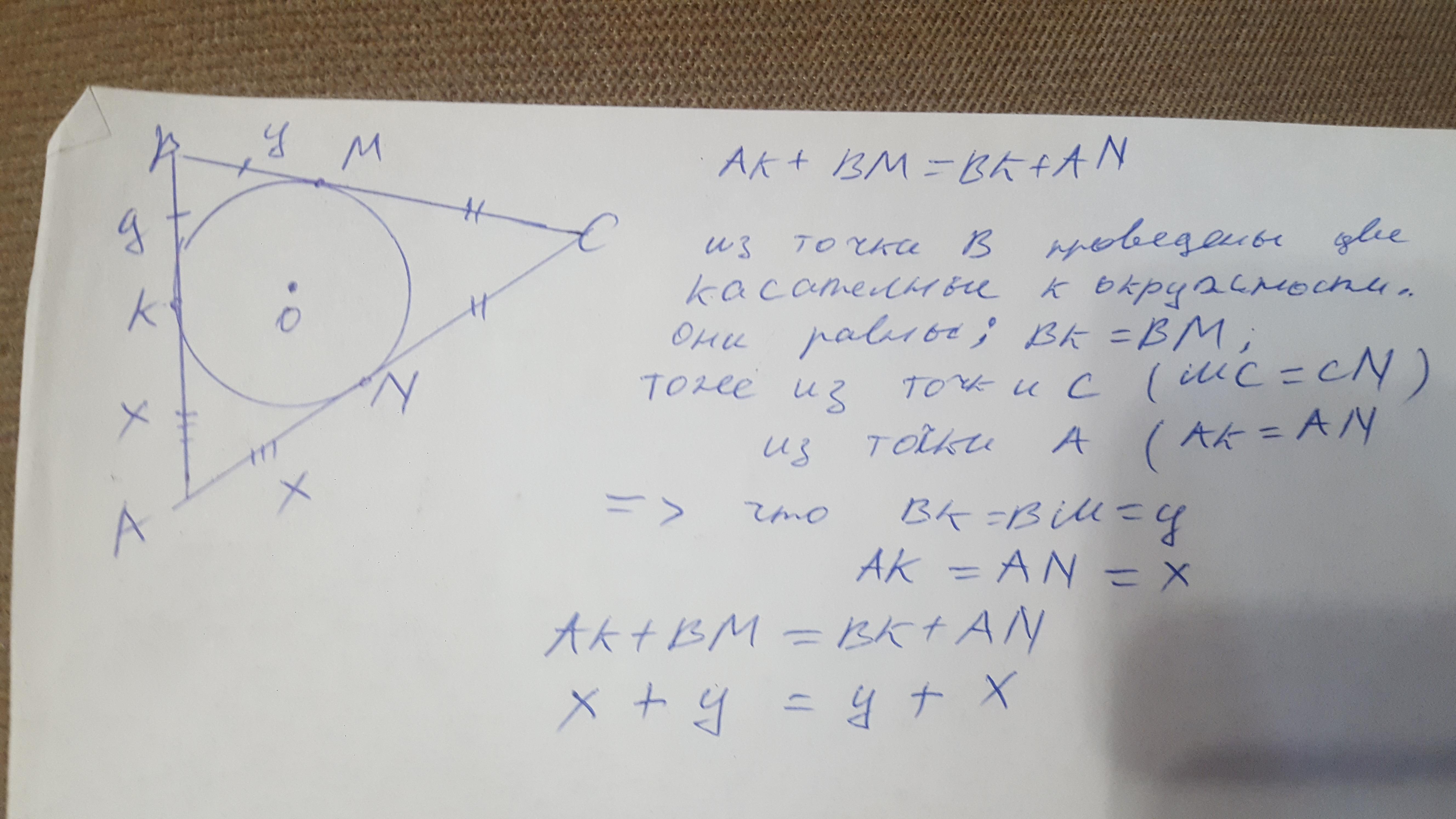 У треугольника ABC вписана окружность с центром в точке O. K, M, N-точки соприкосновения окружности соответственно к сторонам AB, BC, и AC треугольника. Докажите, что AK+BM=BK+AN.