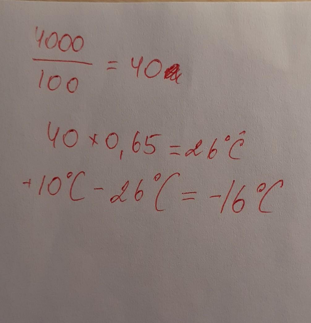 При подъёме вверх на каждые 100 м температура воздуха в тропосфере понижается в среднем на 0,65 °С. Определите, какая температура будет на вершине горы с относительной высотой 4000 м, если у подножья горы температура воздуха составляет +10 °С.