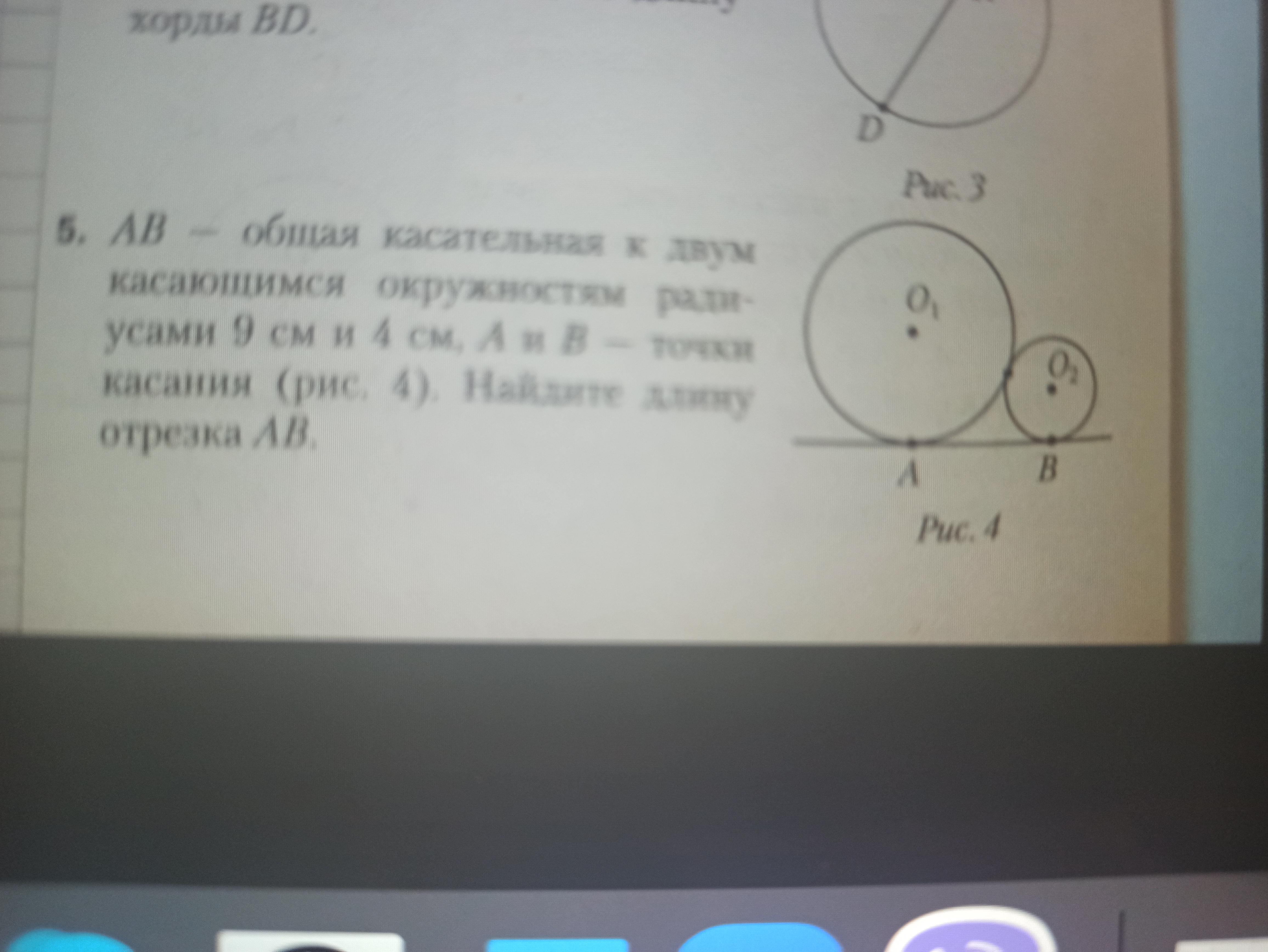AB - общая касательная к двум касающимся усами 9 см окружностям ради касания (рис. 4). Найдите длину отрезка АВ.(!!!!!!! С подробным решением)!!!!!