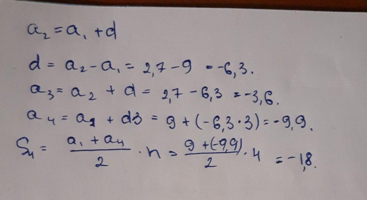 Знайди наступні два члени арифметичної прогресії та суму перших чотирьох членів, якщо a1=9 і a2=2,7. знайти