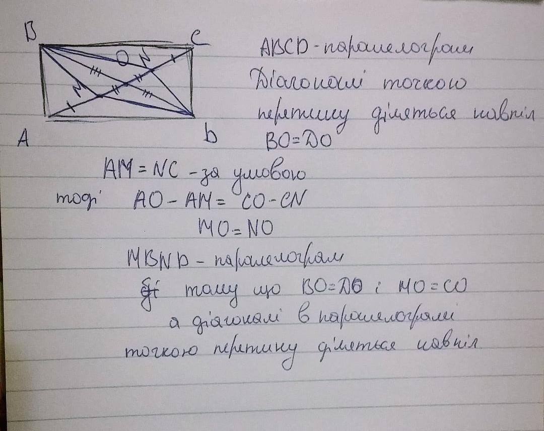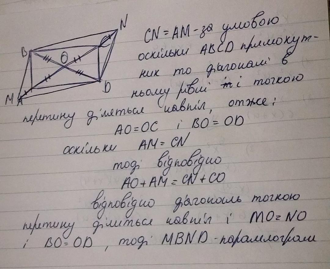 На діагоналі AC прямокутника ABCD відкладено рівні відрізки AM і CN. Доведіть, що MBND - паралелограм. Розвяжіть попередню задачу, якщо точки M і N лежать на продовженнях AC.