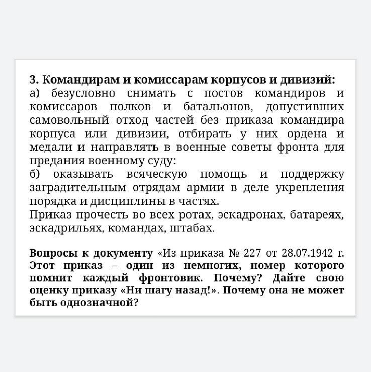 Приказ №227 «Ни шагу назад!» является одним из самых известных, так как он серьёзно ужесточил как нормы поведения в армии, так и наказания за них (от снятия с должности до расстрела).