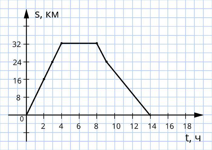 Через 2 ч после начала движения велосипедист был на расстоянии__16___ км. Время до остановки составило _12___ч. Вся поездка длилась __14__ч.