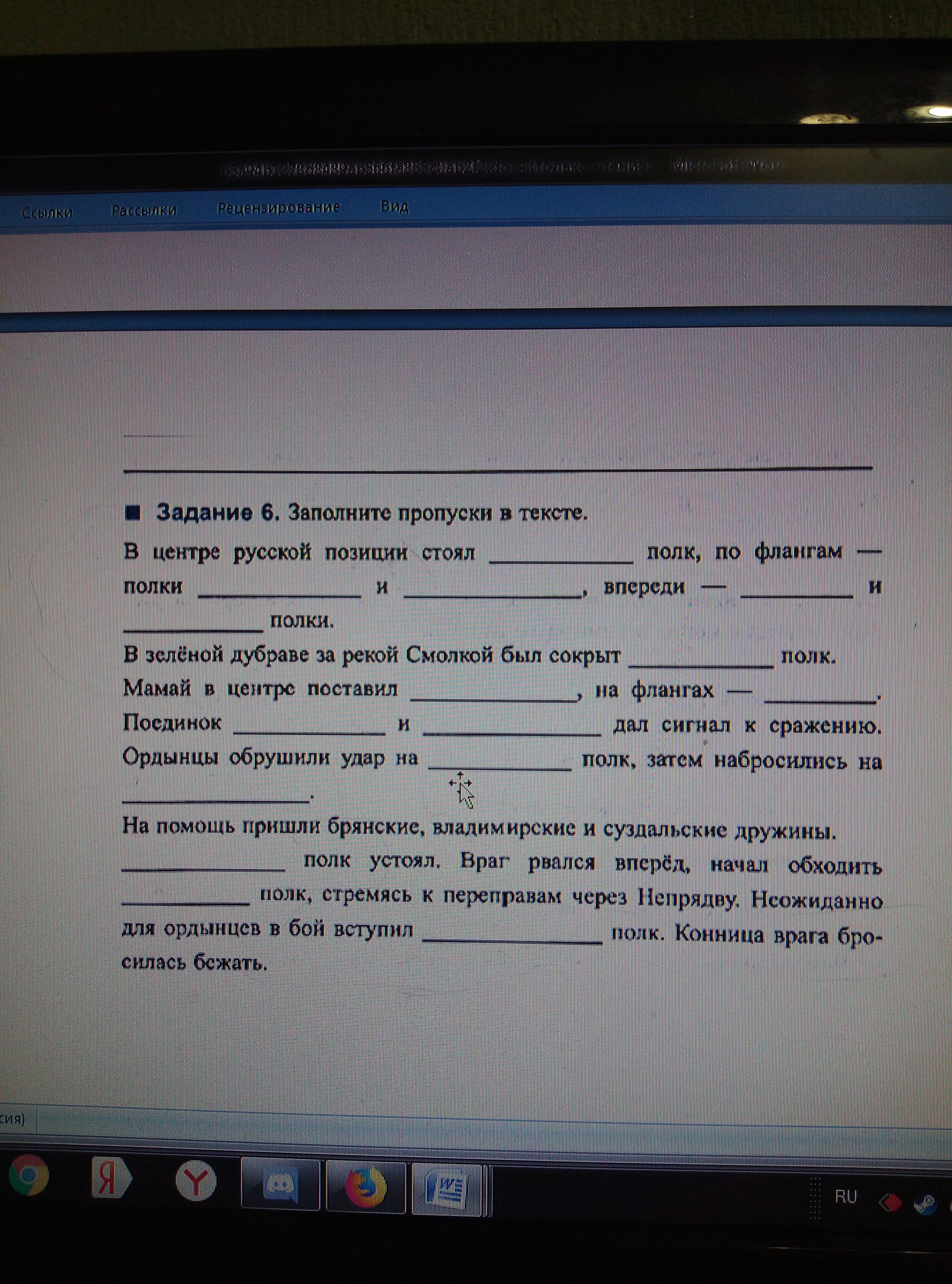 В центре русских войск стоял большой полк, на флангах — полки правой и левой руки, впереди — передовой полк, позади — запасной; на восточной окраине, в зеленой дубраве за рекой Смолкой,— засадный полк. Мамай в центре поставил пехоту, на флангах — конницу.