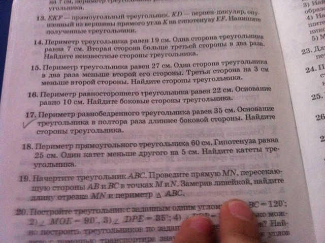 Ответ: по 10см - каждая боковая сторона, 15см - основание треугольника.