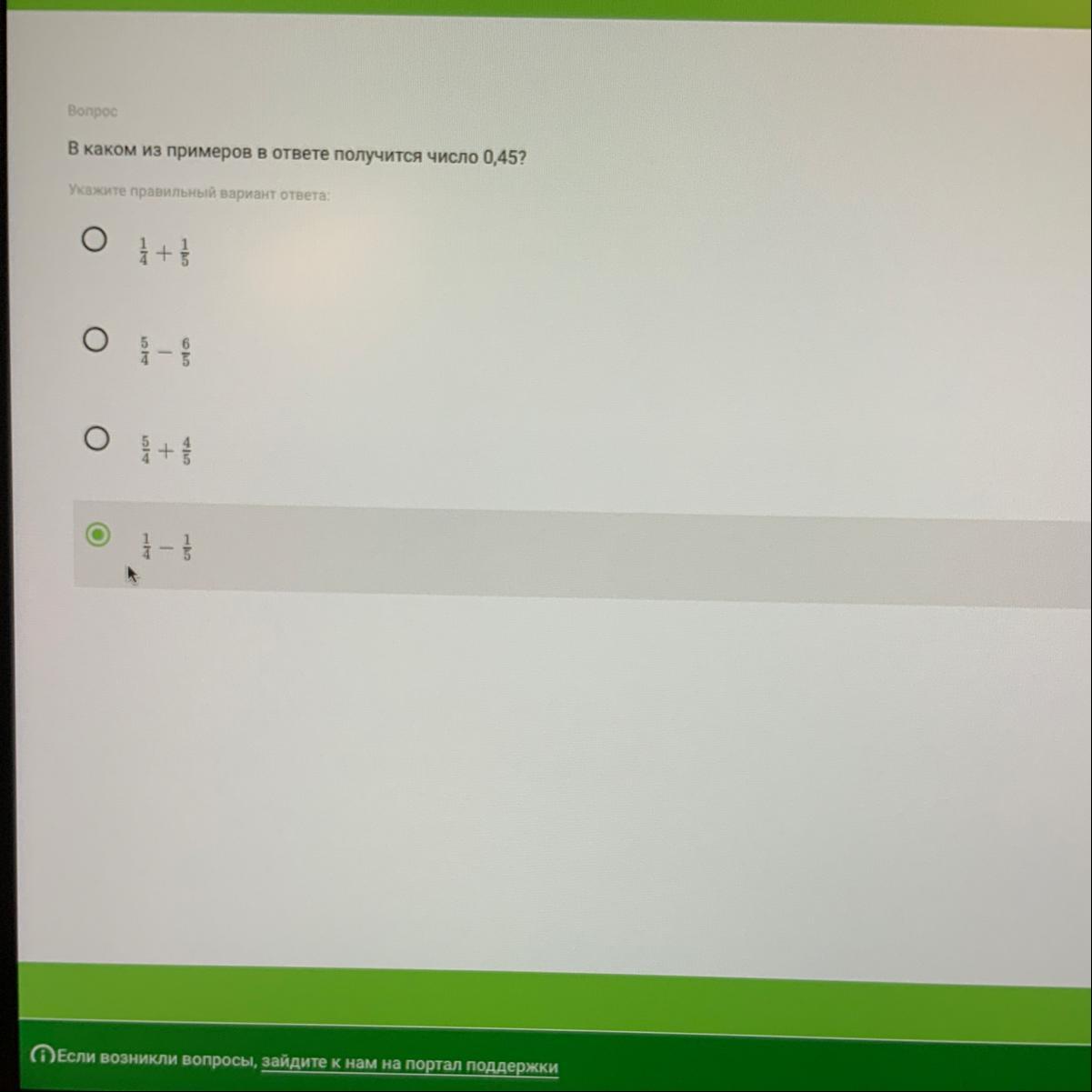 1/4+1/5=(4+5)/20=9/20 домножаем на 5 числитель и знаменатель 45/100=0.45