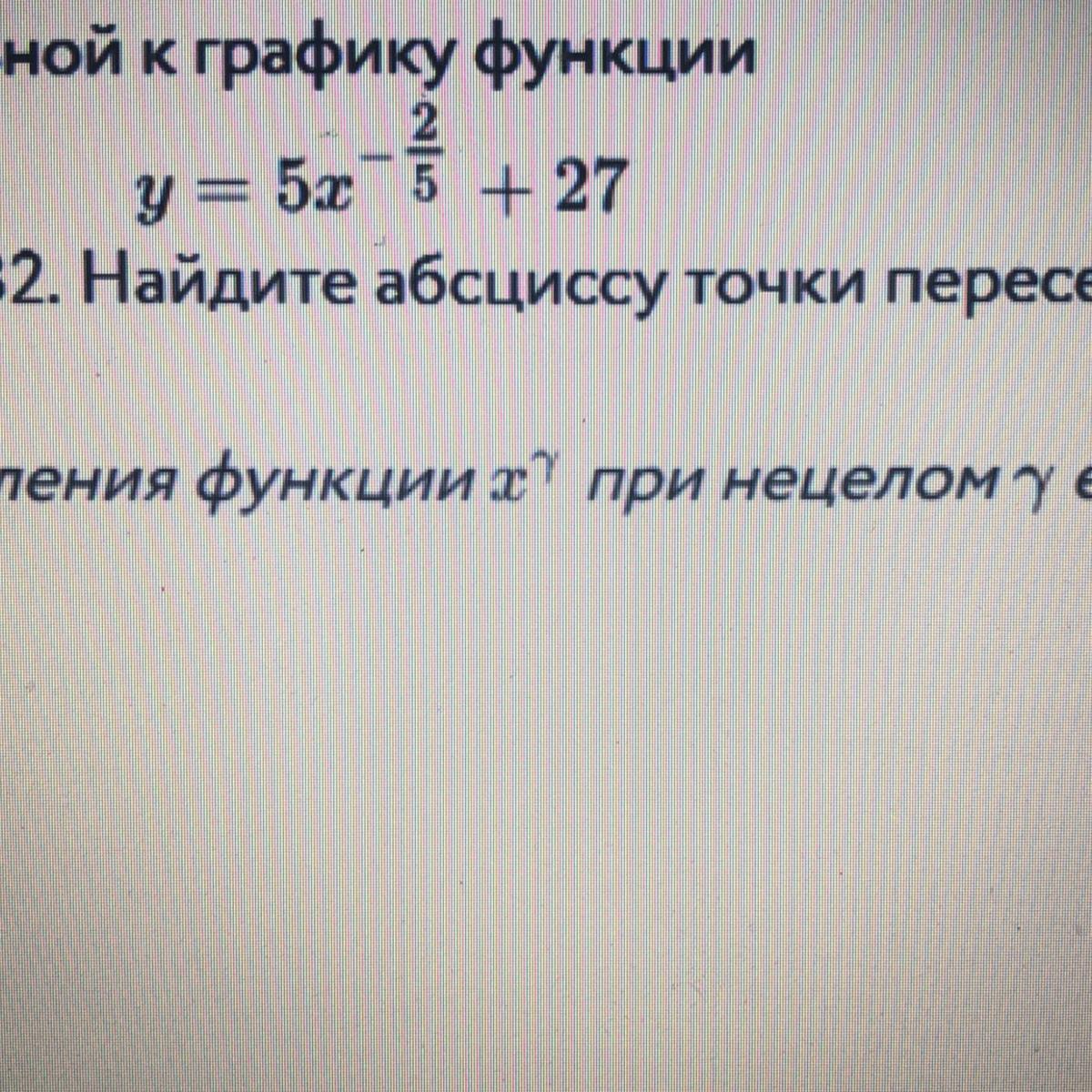 Составьте уравнение касательной к графику функции y = 5x^-1/2 + 27(На рисунке),в точке графика с ординатой 32.Найдите абсциссу точки пересечения касательной с осью Ox.