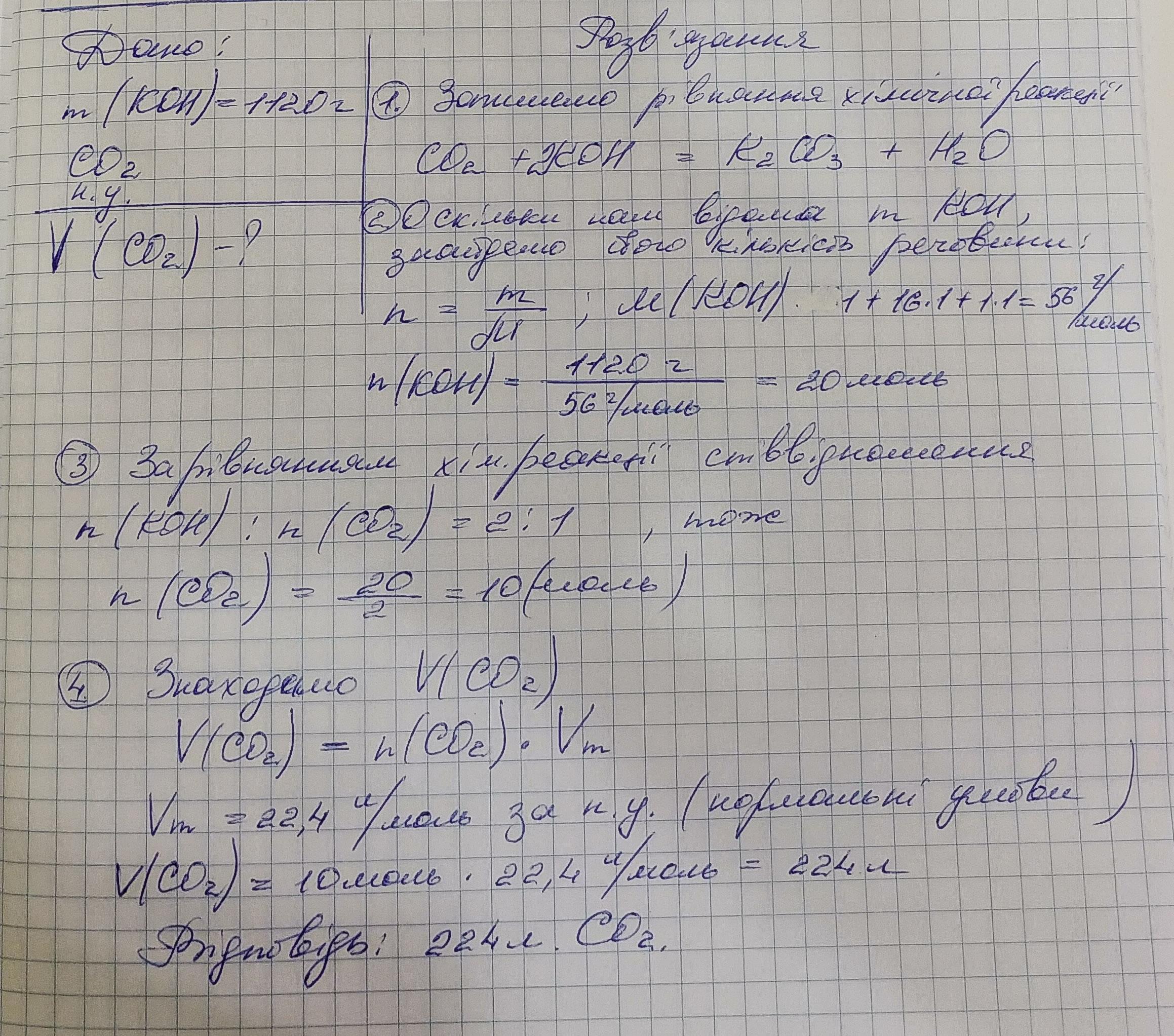 Зазнач об'єм вуглекислого газу, який повністю прореагував з калій гідроксидом, масою 1120 г, утворивши сіль. С объяснением.