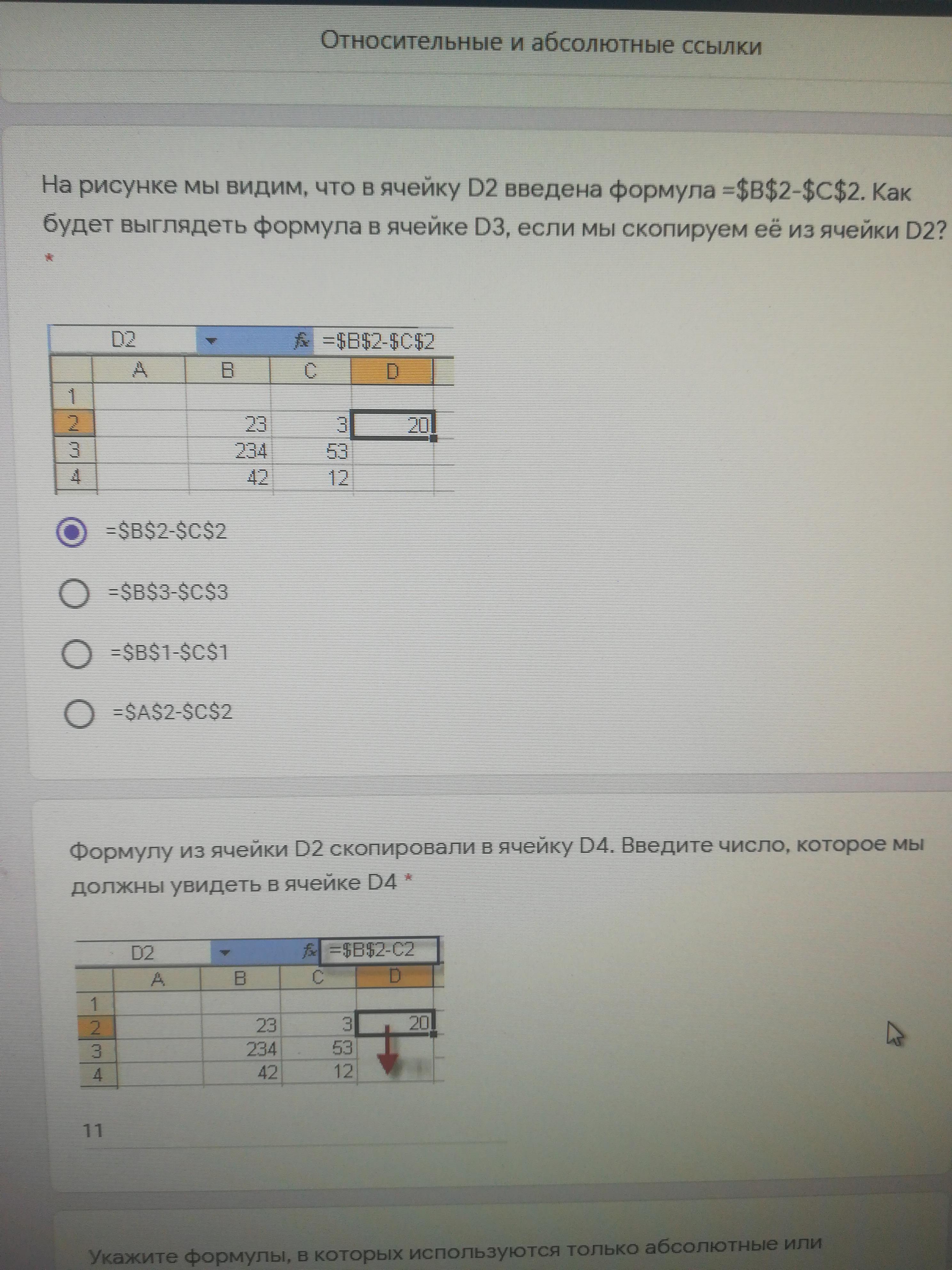 2. Формулу из ячейки D2 скопировали в ячейку D4. Введите число, которое мы должны увидеть в ячейке D4 . формула D2 =$B$2-C2