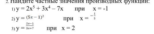 1)y=2x^5+3x^4-7x\y'(x)=10x^4+12x^3-7\y'(-1)=10-12-7=-9\\2)y=(5x-1)^2\y'(x)=2(5x-1)*5=10(5x-1)\y'(-frac{1}{5})=1=10(-1-1)= -20\\3)y=frac{2x-1}{3x+7}\y'(x)=frac{2*(3x+7)-(2x-1)*3}{(3x+7)^2}=frac{6x+14-6x+3}{(3x+7)^2} =frac{17}{(3x+7)^2}\ y'(2)=frac{17}{169}