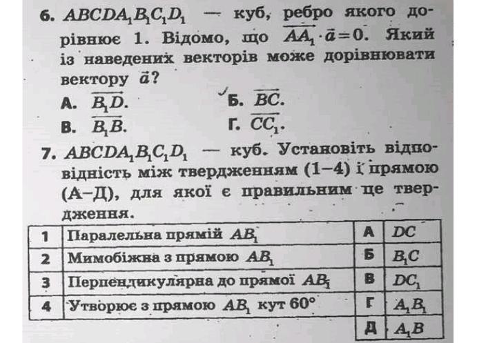 6) ABCDA1B1C1D1 — куб, ребро которого равняется 1. Известно, что вектор АА1*а = 0. Какой из приведенных векторов может быть равен вектору а?