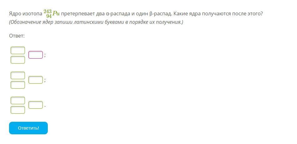Ядро изотопа 243/94Pu претерпевает два α-распада и один β-распад. Какие ядра получаются после этого? (Обозначение ядер запиши латинскими буквами в порядке их получения.)