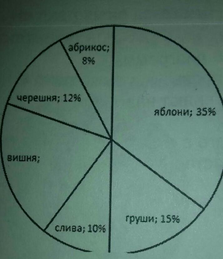 На диаграме показаны данные о фруктовых дерявьях в саду.Используя данные круговой диаграмы,ответьте на следущие вопросы: