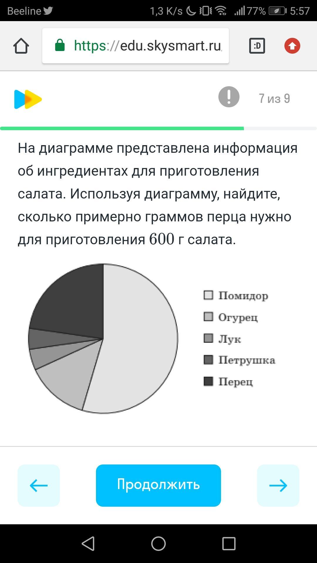 на диаграмме представлены данные об ингредиентах для приготовления салата. Используя диаграмму, найдите, сколько примерно граммов перца нужно для 600г салата